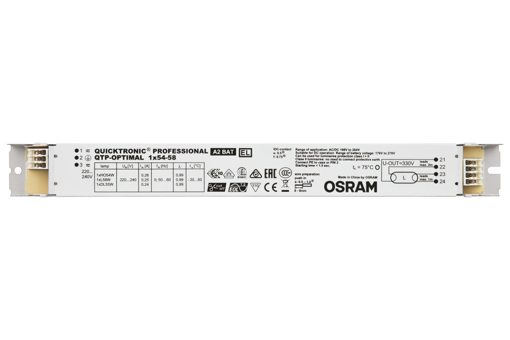 Výhody produktu: Dlouhá životnost světelného zdroje. Žádné nepříznivé dopady při častém zapínání a vypínání. Automatický restart po výměně světelného zdroje. Perfektní zapínání světelného zdroje pro instalace s pohybovými čidly. Systém certifikovaný podle VDE/VDE pro EMC. Velmi vysoká energetická účinnost díky odpojovací technologii. Vlastnosti produktu: Napájecí napětí: 220…240 V. Síťové napětí: 198 – 264 V. Kmitočet: 0 Hz | 50 Hz | 60 Hz. Zapnutí světelného zdroje s optimálním předehříváním vlákna. Životnost: až 100.000 h (teplota Tc = 65 °C, četnost poruch max. 10 %). Index energetické účinnosti EEI: A2 BAT. Automatické vypnutí vadných světelných zdrojů a zdrojů na konci života (EoL T.2). Bezpečnost: podle EN 61347-2-3. Provoz světelného zdroje: po EN 60929. Druh použití: Systémy nouzového osvětlení podle EN 50172 / DIN VDE 0108-100. Průmysl. Společné kanceláře, chodby a skladovací prostory. Veřejné budovy. Sportovní haly a továrny. Světelné pásy. Vhodné pro nouzové osvětlení (provoz na stejnosměrný proud). Modernizace stávajících systémů.