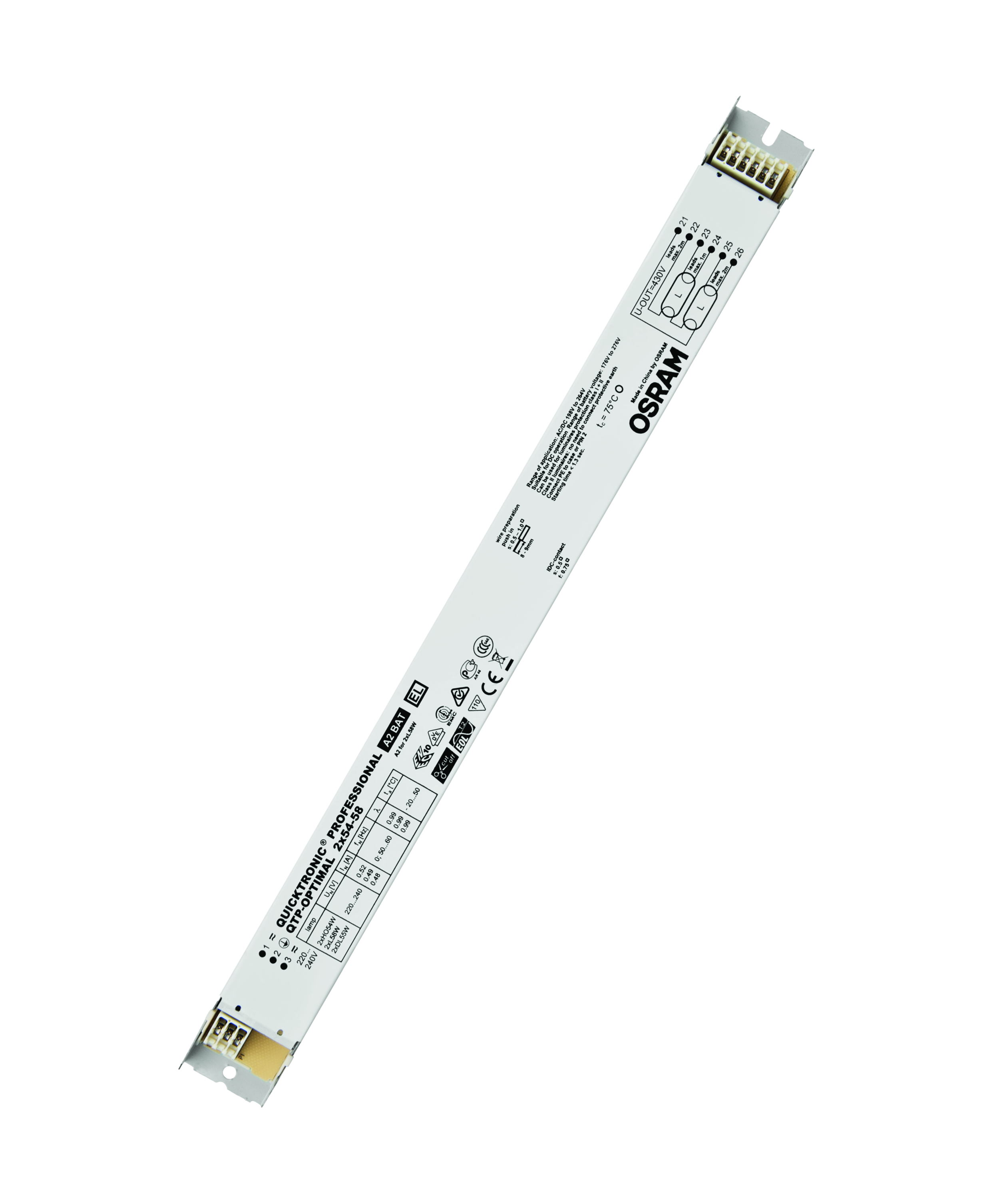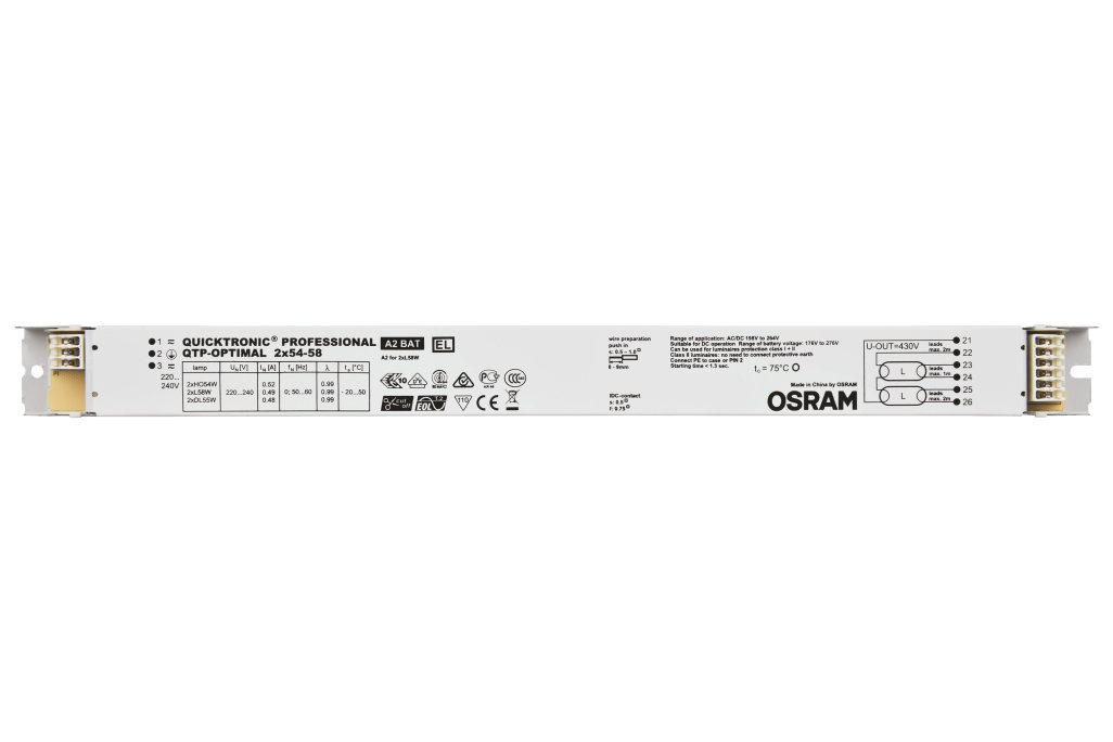 Výhody produktu: Dlouhá životnost světelného zdroje. Žádné nepříznivé dopady při častém zapínání a vypínání. Automatický restart po výměně světelného zdroje. Perfektní zapínání světelného zdroje pro instalace s pohybovými čidly. Systém certifikovaný podle VDE/VDE pro EMC. Velmi vysoká energetická účinnost díky odpojovací technologii. Vlastnosti produktu: Napájecí napětí: 220…240 V. Síťové napětí: 198 – 264 V. Kmitočet: 0 Hz | 50 Hz | 60 Hz. Zapnutí světelného zdroje s optimálním předehříváním vlákna. Životnost: až 100.000 h (teplota Tc = 65 °C, četnost poruch max. 10 %). Index energetické účinnosti EEI: A2 BAT. Automatické vypnutí vadných světelných zdrojů a zdrojů na konci života (EoL T.2). Bezpečnost: podle EN 61347-2-3. Provoz světelného zdroje: po EN 60929. Druh použití: Systémy nouzového osvětlení podle EN 50172 / DIN VDE 0108-100. Průmysl. Společné kanceláře, chodby a skladovací prostory. Veřejné budovy. Sportovní haly a továrny. Světelné pásy. Vhodné pro nouzové osvětlení (provoz na stejnosměrný proud). Modernizace stávajících systémů.