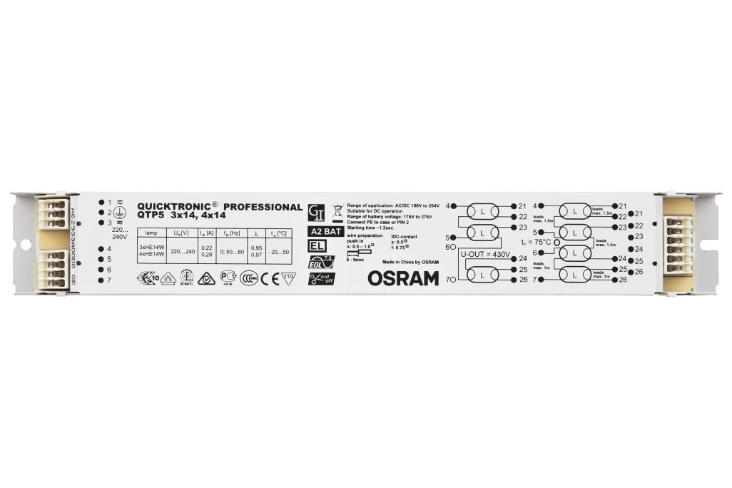 Výhody produktu: Dlouhá životnost světelného zdroje. Žádné nepříznivé dopady při častém zapínání a vypínání. Perfektní zapínání světelného zdroje pro instalace s pohybovými čidly. Automatický restart po výměně světelného zdroje. Systém certifikovaný podle VDE/VDE pro EMC. Velmi vysoká energetická účinnost díky odpojovací technologii. Vlastnosti produktu: Napájecí napětí: 220…240 V. Síťové napětí: 198 – 264 V. Kmitočet: 0 Hz | 50 Hz | 60 Hz. Zapnutí světelného zdroje s optimálním předehříváním vlákna. Životnost: až 100.000 h (teplota Tc = 65 °C, četnost poruch max. 10 %). Index energetické účinnosti EEI: A2 BAT. Automatické vypnutí vadných světelných zdrojů a zdrojů na konci života (EoL T.2). Bezpečnost: podle EN 61347-2-3. Provoz světelného zdroje: po EN 60929. Druh použití: Systémy nouzového osvětlení podle EN 50172 / DIN VDE 0108-100. Průmysl. Společné kanceláře, chodby a skladovací prostory. Veřejné budovy. Sportovní haly a továrny. Světelné pásy. Vhodné pro nouzové osvětlení (provoz na stejnosměrný proud). Modernizace stávajících systémů.