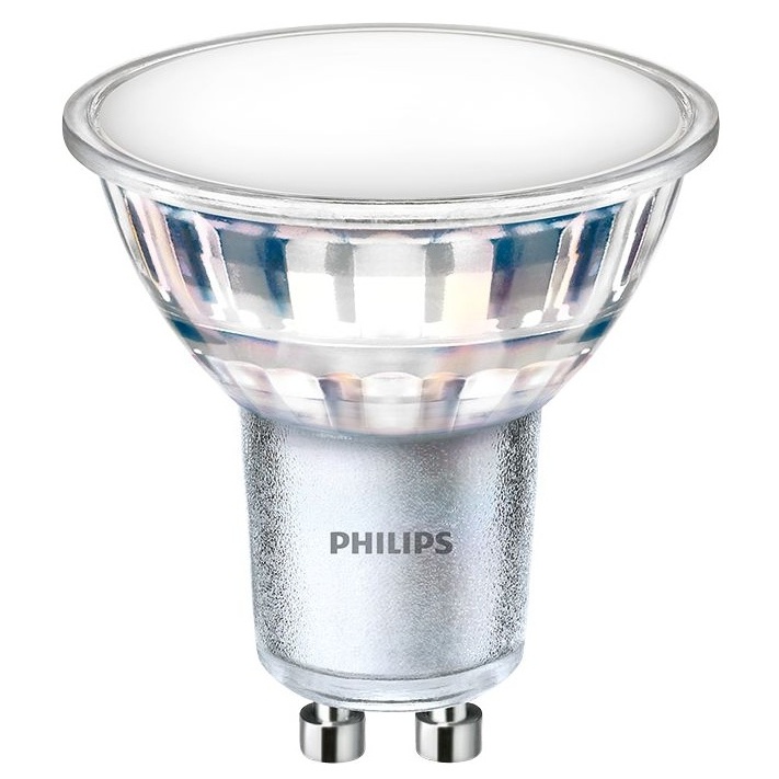 Bodová LED žárovka Philips CorePro LEDspot je určena pro spotová svítidla s paticí GU10. Její příkon je 4,9 W, má silnou svítivost 550 lm v širokém úhlu svitu 120°. Odpovídá svitu 50 W halogenové žárovky. Vydává nestmívatelné teplé bílé světlo 3000 K.