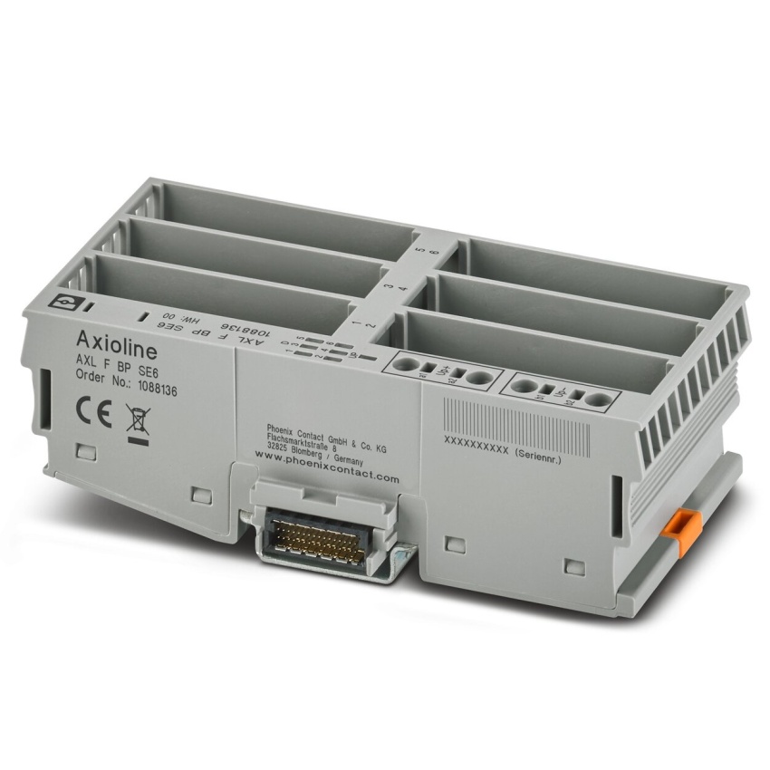 - Axioline F, Backplane, 6 slotů pro chytré prvky Axioline, přenosová rychlost v místní sběrnici: 100 MBit/s, krytí: IP20