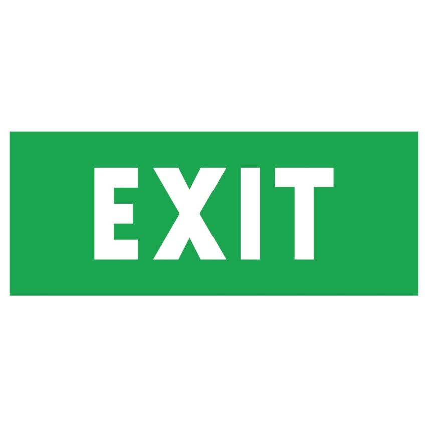 Piktogram pro nouzová svítidla: EXIT. Splňuje požadavky normy ISO 3864 a CEE 92-58.