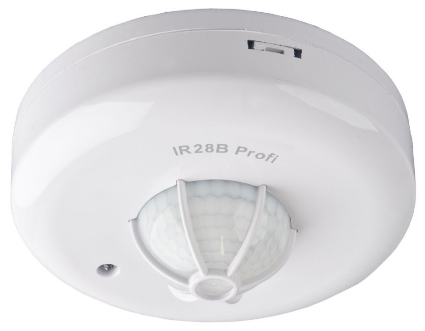Stropní pohybové čidlo IR28B Profi je určeno pro spínání žárovek i zářivek. Slouží k automatickému spínání osvětlení po narušení detekčního pole v horizontální i vertikální rovině (uvnitř jsou 3 senzory). Vnitřní zapojení s ochranou proudových nárazů při spínání kapacitních zátěží zvyšuje odolnost kontaktů použitého relé. Je vhodný do míst, kde hlavním požadavkem je větší počet spínání osvětlení (schodiště, chodby, průmyslové objekty). Další parametry: spínaný výkon 3680 W (max.16A), regulace citlivosti na světlo < 3 Lux až 1000 Lux.