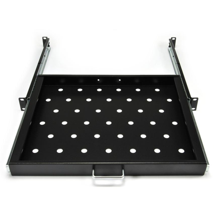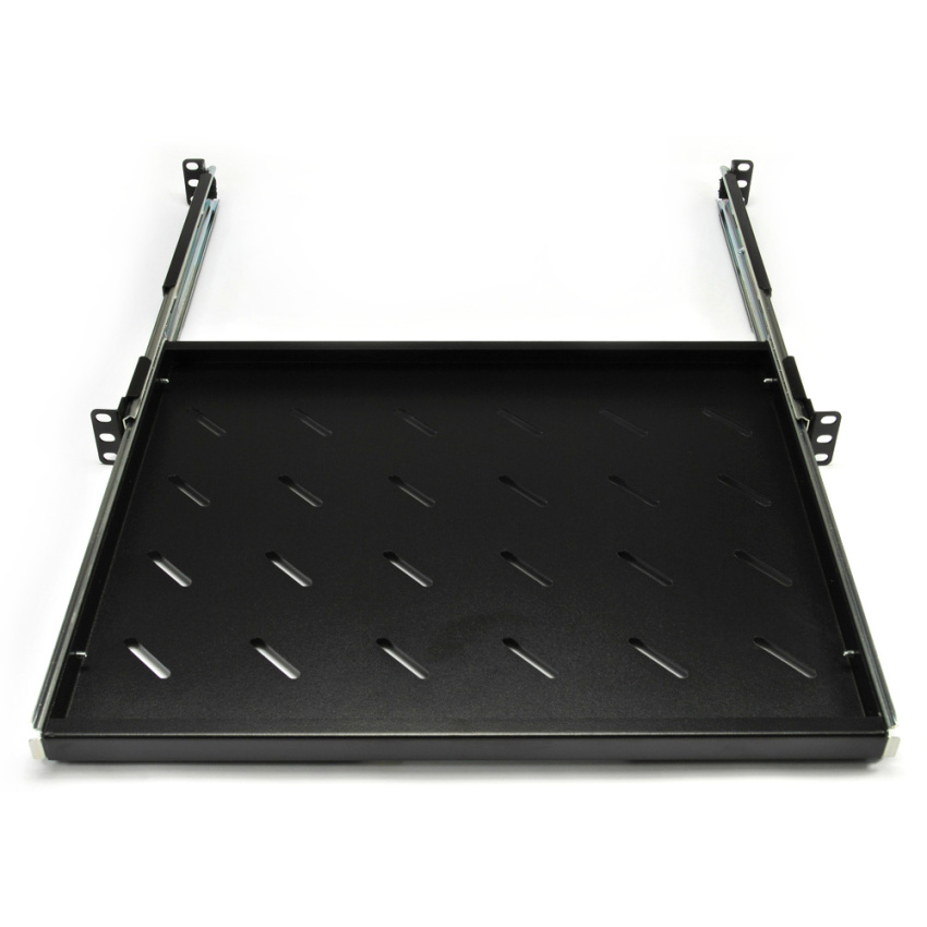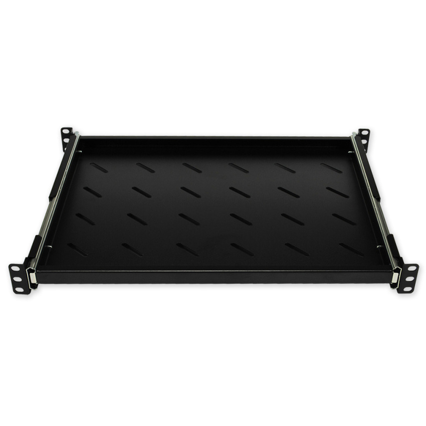 Polička výsuvná 19" s perforací, výška 1U, montáž do předních/zadních lišt s nosností do 20 kg, hloubka 350 mm.