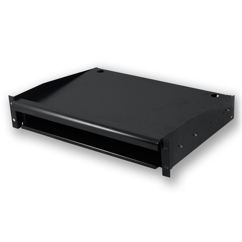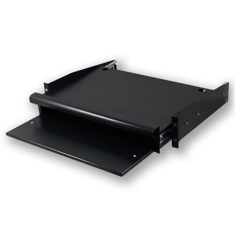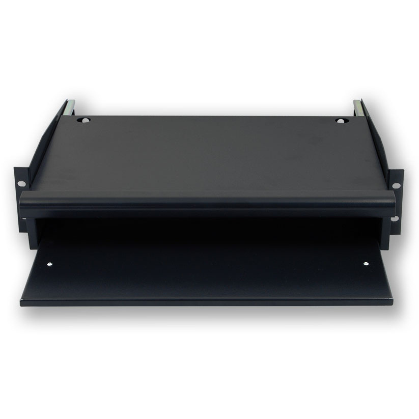 Polička výsuvná 19" pro klávesnici a myš, výška 2U, montáž do předních lišt s nosností do 20 kg, hloubka 350 mm.