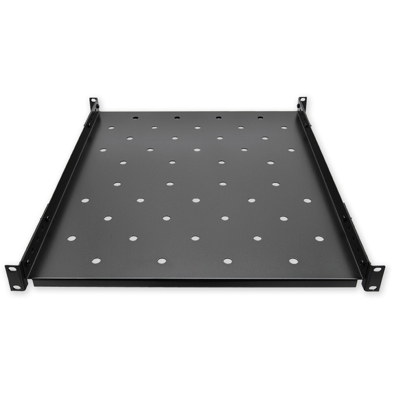 Polička 19" s perforací, výška 1U, montáž do předních lišt s nosností do 60 kg, zadní úchyty, hloubka 550 mm.