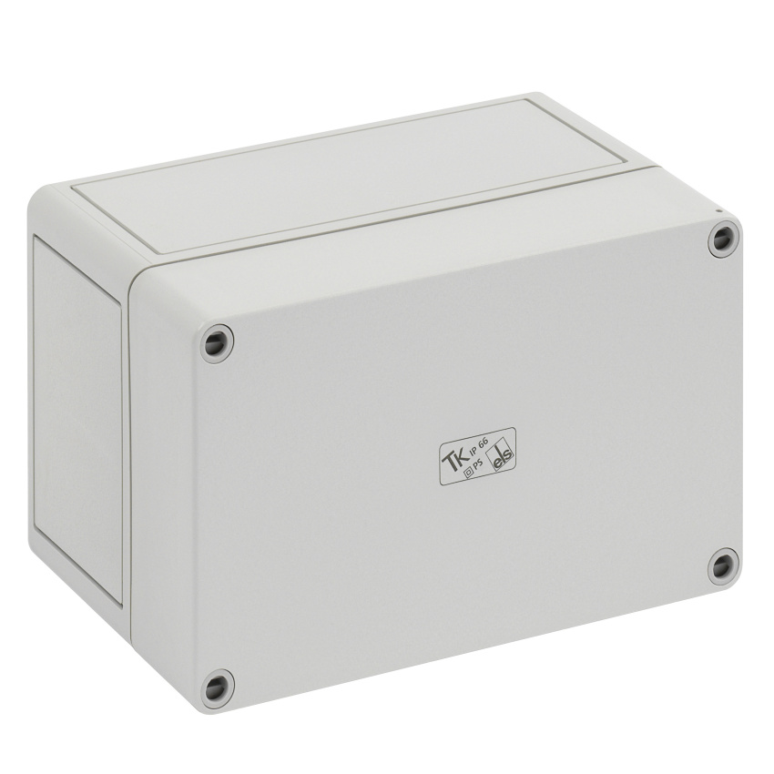 Prázdná skříň, krabice a víko: polystyren, šedá, podobně RAL 7035, s krytím IP66, s pevností IK07, třída ochrany II, měrné izolační napětí Ui 690VAC/DC, Ui=1000VDC, bez halogenů, 180 x 110 x 111 mm, bez průchodek.