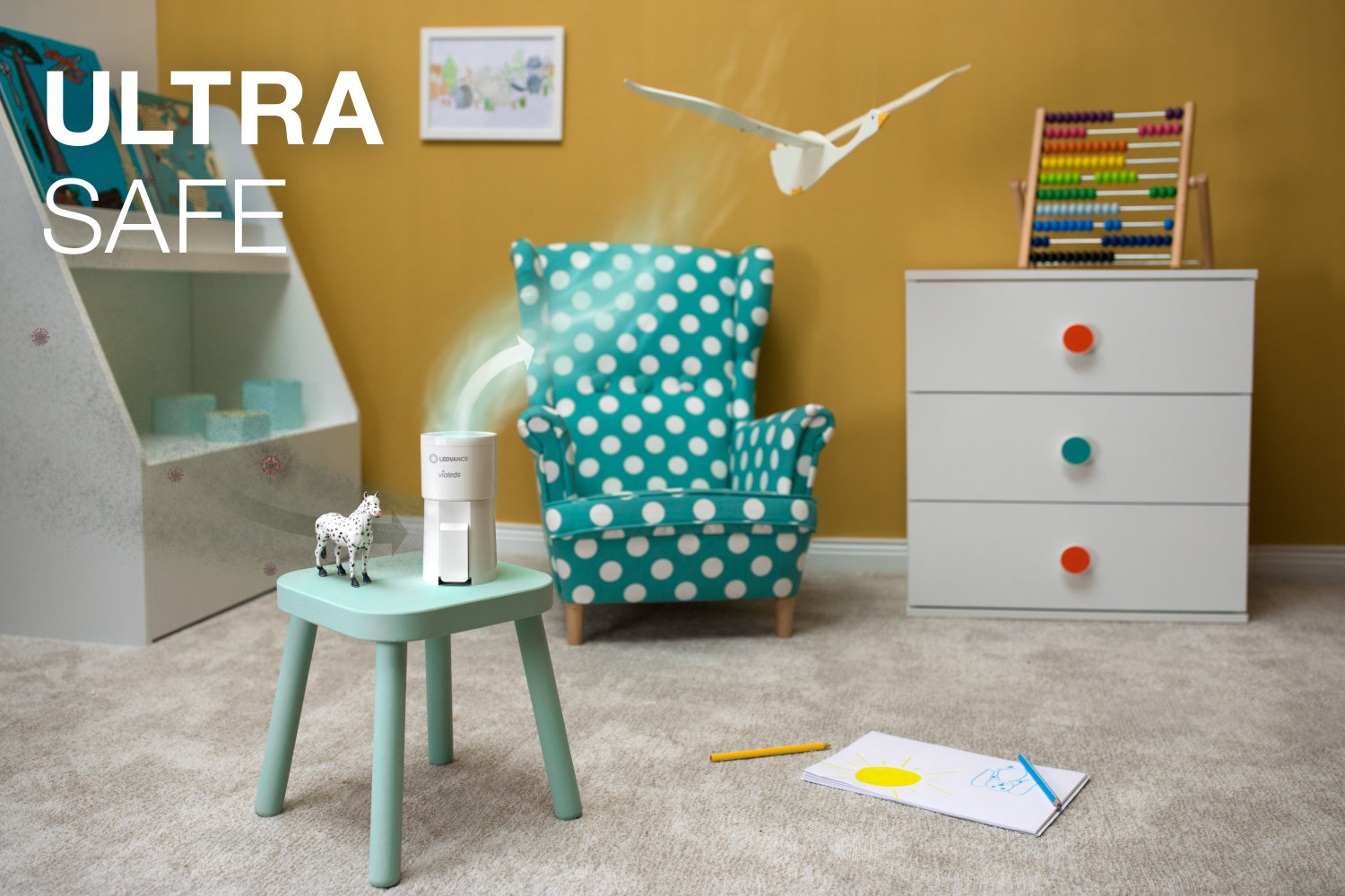 - Zbavuje vzduch zápachu a ničí a zabíjí viry a bakterie pomocí UV LED záření. Snižuje tak riziko nákazy.