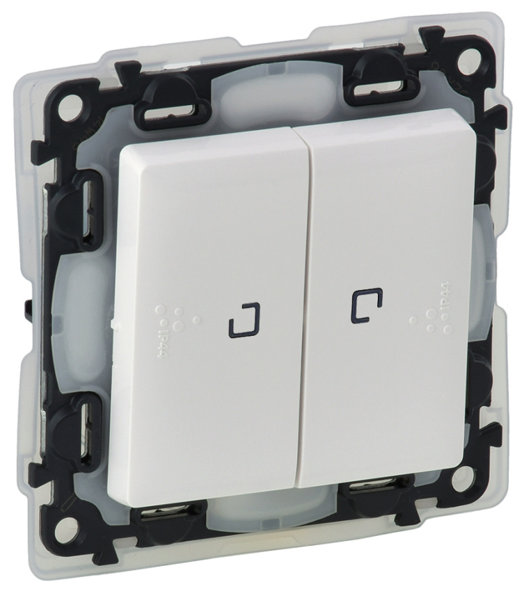 Dvojitý střídavý přepínač ř.6+6 s orientačním podsvětlením IP 44, bezšroubový v bílé barvě. 10AX-250 V AC