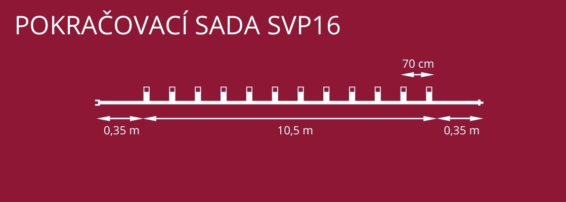 Prodlužovací souprava SVP-16 bez napájecího transformátoru, autentický „svíčkový“ efekt. jednotlivé světelné zdroje svítí nezávisle na sobě. Svíčková prodlužovací souprava je určena pouze k připojení k základní soupravě Sada START. Nemá vlastní zdroj napájení a má krátký přívod pouze 35 cm. K základní soupravě SVÍČ KA "Sada START" je možné připojit MAXIMÁLNĚ 2 prodlužovací soupravy Svíčka SVP-16 . Maximální délka svítící části řetězu je potom 31,5 m.