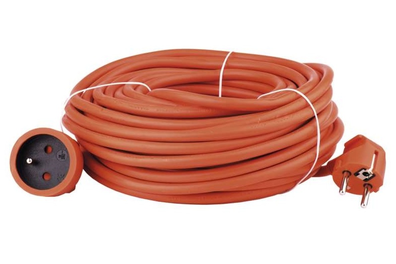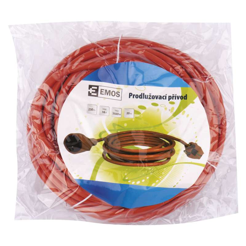 Oranžový prodlužovací přívod s jednou zásuvkou - spojka, délkou 20 m a průřezem vodiče 1,5 mm2. Vhodný pro maximální zátěž 16 A max. Prodlužovací přívod 20 m na 230 V AC slouží k prodloužení elektrické energie tam, kam pevná zásuvka nedosáhne.