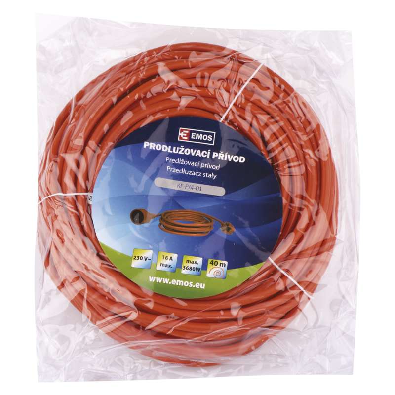 Oranžový prodlužovací přívod s jednou zásuvkou - spojka, délkou 40 m a průřezem vodiče 1,5 mm2. Vhodný pro maximální zátěž 16 A max. Prodlužovací přívod 40 m na 230 V AC slouží k prodloužení elektrické energie tam, kam pevná zásuvka nedosáhne.