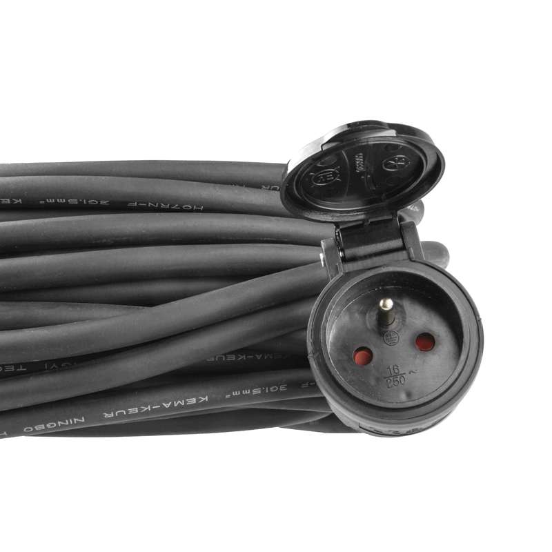 Prodlužovací kabel s gumovou vidlicí a jednou zásuvkou (dětské clonky). Kabel má délků 10m.
