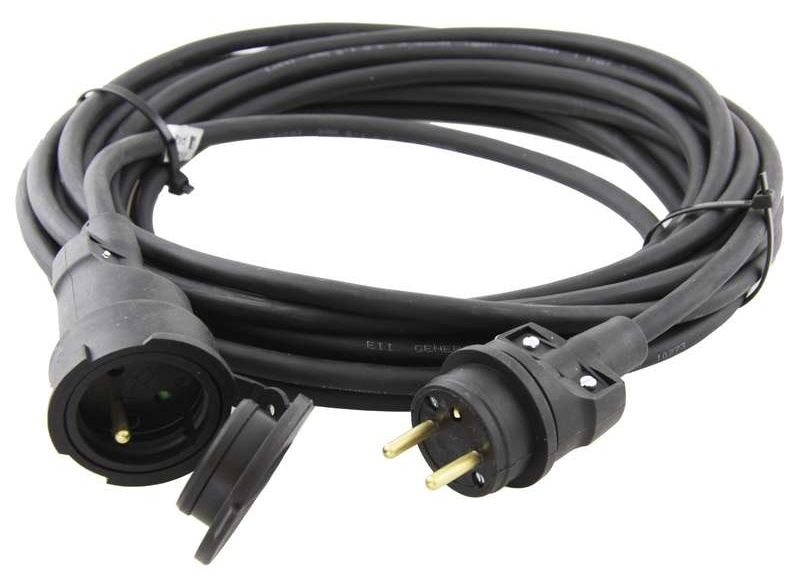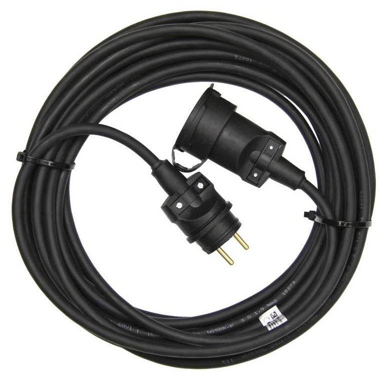 Prodlužovací kabel s gumovou vydlicí a jednou zásuvkou. Kabel má délků 25m.