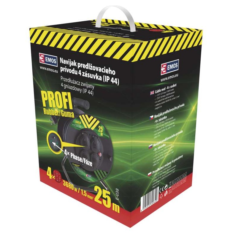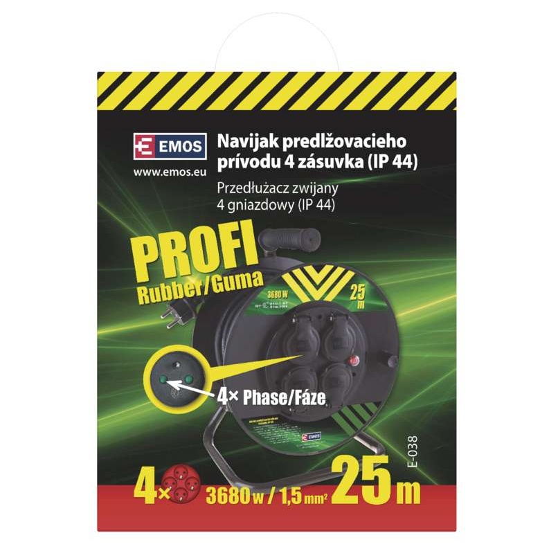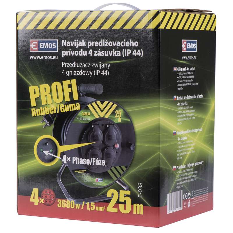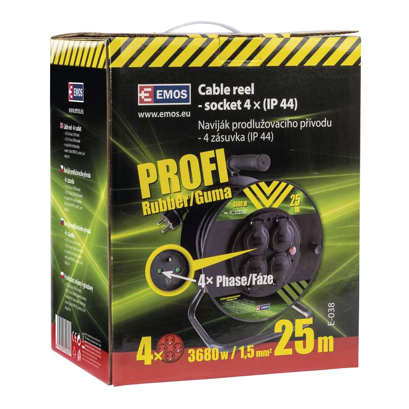 Prodlužovací kabel (buben) značky EMOS v černém provedení. Kabel má čtyři zásuvky. Prodlužovací kabel má délku 25 m, průřez 1,5 mm2. Prodlužovací kabel má tepelnou pojistku a gumovou izolaci. Kabel je vhodný zejména do garáží a dílen.