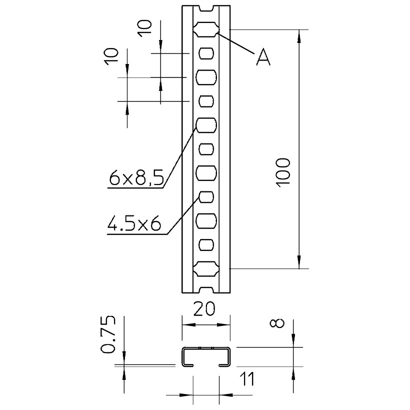 Profilová lišta s šířkou výřezu 11 mm, děrovaná, u verze „A“ odlomitelná každých 10 cm.