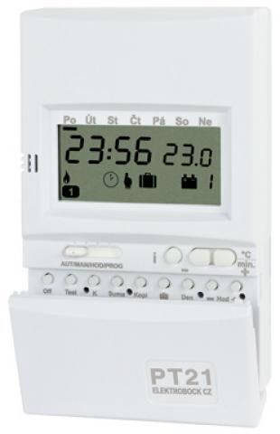 Prostorový digitální termostat PT21 nabízí široké uplatnění při regulaci teploty v domácnostech, kancelářích nebo dílnách. Výhody: možnost nastavení hystereze v rozmezí od 0,1°C do 1,5°C, rychlý test správného zapojení termostatu a kotle tlačítkem "Test", jednodušší nastavování hodin a dne, pouze tlačítka."+/-", rychlejší kopírování dní tlačítka. "Kopi", na každý den jiný program, jednoduché ovládání i programování, možnost krátkodobé změny teploty programu, snadná montáž na všechny typy instalačních krabic KU/KP68, úsporný režim dovolená (maximální počet dní 99), nízká spotřeba, informace o provozních hodinách kotle, regulace teploty po 0,5°C, vícefunkční displej, tlačítka. "Off" pro vypnutí kotle, uchování paměti při výměně baterií po dobu cca 25s. Další parametry: spínací prvek relé, výstup max. 5A, životnost baterie - topná sezóna, přesnost měření ±0,5°C, min. programovací čas 10 min.