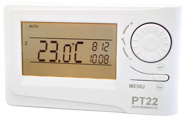 Prostorový bateriový termostat PT22 s podsvíceným velkým displejem pro regulaci teploty v domácnostech, kancelářích nebo dílnách. Výhodou je rychlá změna požadované teploty pouhým otočením kolečka a možnost nastavení týdenního programu s 6-ti teplotními změnami na den, programování po 10-ti minutách a 0.5 °C, možnost programování po dni nebo Po-Pá, So-Ne a Po-Ne, intuitivní navigace ve vybraném jazyku (CZ/PL/EN/DE), možnost nastavení hystereze, manuální režim (MANU), trvalé vypnutí (OFF), režim DOVOLENÁ, protinámrazová ochrana (3 °C), funkce pro otestování správného zapojení, automatická změna LETNÍ/ZIMNÍ čas, indikace slabé baterie, výstup (bezpotenciální kontakt) max. 5 A/ 250 V AC. Pracovní teplota 0°C až +40°C, přesnost měření ±0,5°C, min. programovací čas 10 min., spínací kontakt relé.