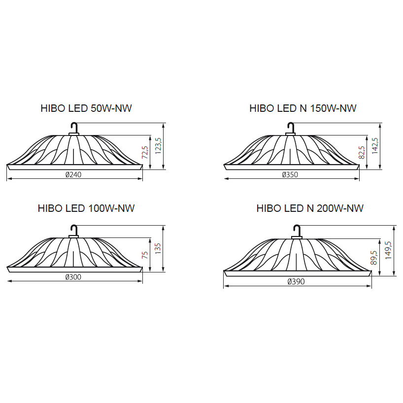 HIBO LED je svítidlo typu "High Bay" využívající modul Led s SMD diodami. Svítidlo má vysoký stupeň krytí IP65, díky tomu je možné ho namontovat na místech s vysokou prašností a místech, které jsou vystaveny vodě. Jedná se o průmyslové svítidlo, které je ideální pro osvětlení skladu, výrobních hal a velkých komerčních prostorů.