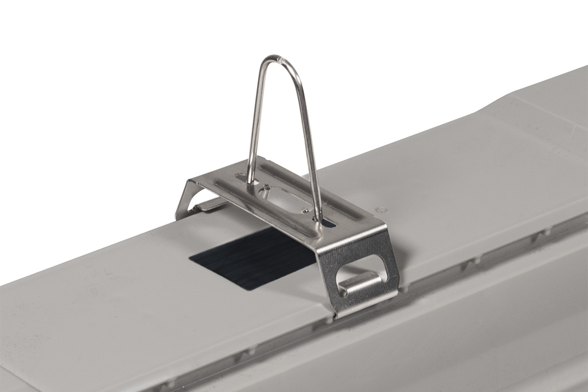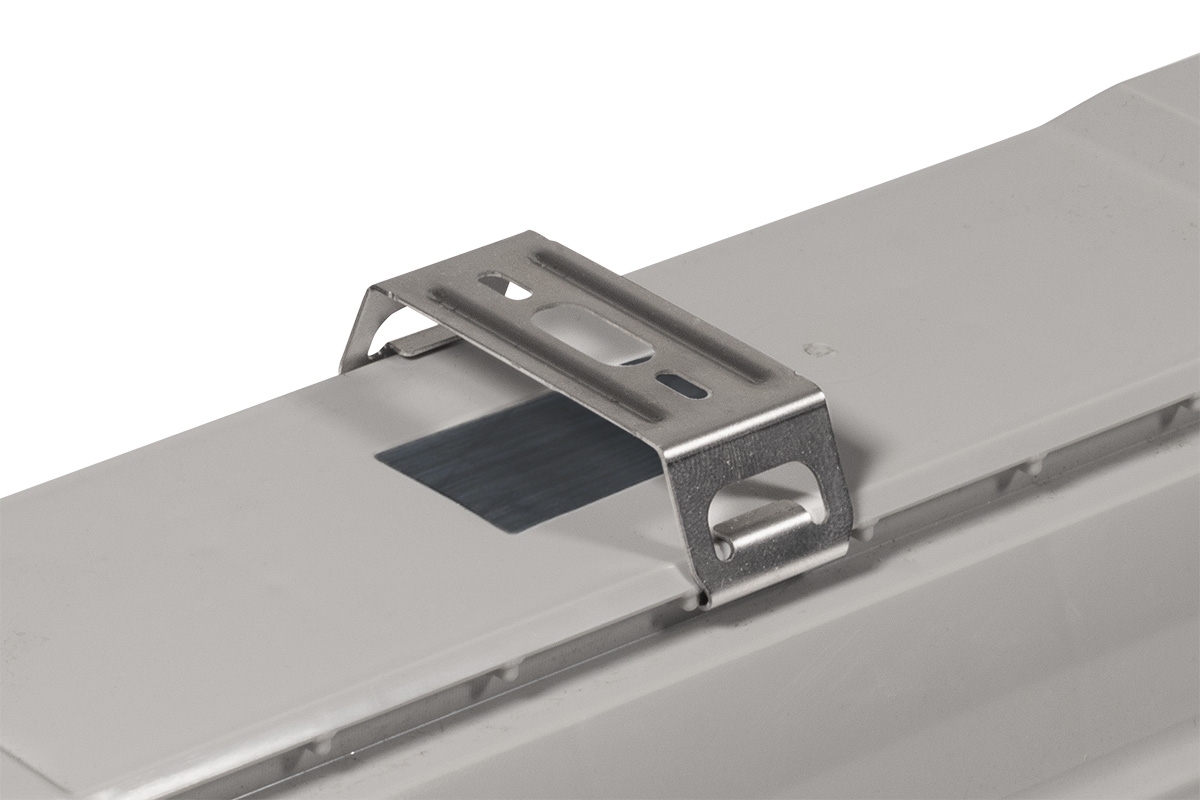 NANOTTICA 1.4ft VP ABS je LED svítidlo určené pro venkovní zastřešené prostory a chemicky náročné provozy, kde je vyžadována vysoká odolnost a spolehlivost. Svítidlo využívá čirý AC difuzor s patentovanou nanooptikou, která zajišťuje přesné směrování světla a velmi nízký index oslnění. Podle technického listu (strana 1) poskytuje varianta 4400/840 světelný tok svítidla 3980 lm při spotřebě 27,3 W (účinnost 146 lm/W). Svítidlo je navrženo pro optimální montážní výšku 3,5 až 8 metrů a nabízí krytí IP66/IP69, mechanickou pevnost IK06 a provozní teplotu −25 až 45 °C. Konstrukce s ventilační membránou eliminuje vznik kondenzátu, což je patrné z technického popisu na straně 1. Základna je vyrobena z tmavě šedého ABS s vysokou chemickou odolností, difuzor z čirého akrylátu (AC). Součástí balení jsou nerez háčky a nerez spony, jak ukazuje obrázek na straně 2. Variabilní rozteč zavěšení 700–960 mm umožňuje snadnou instalaci i na stávající montážní prvky.