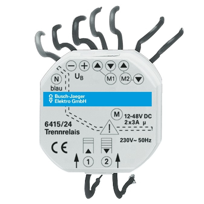 Relé rozdělovací Busch-Jalousiecontrol. Pro společné spínání 2 žaluziových pohonů 12 - 48 V DC, s mechanickým blokováním výstupních kontaktů, s galvanickým oddělením vstupů a výstupů. Ovládací napětí: 230 V AC.