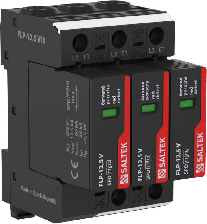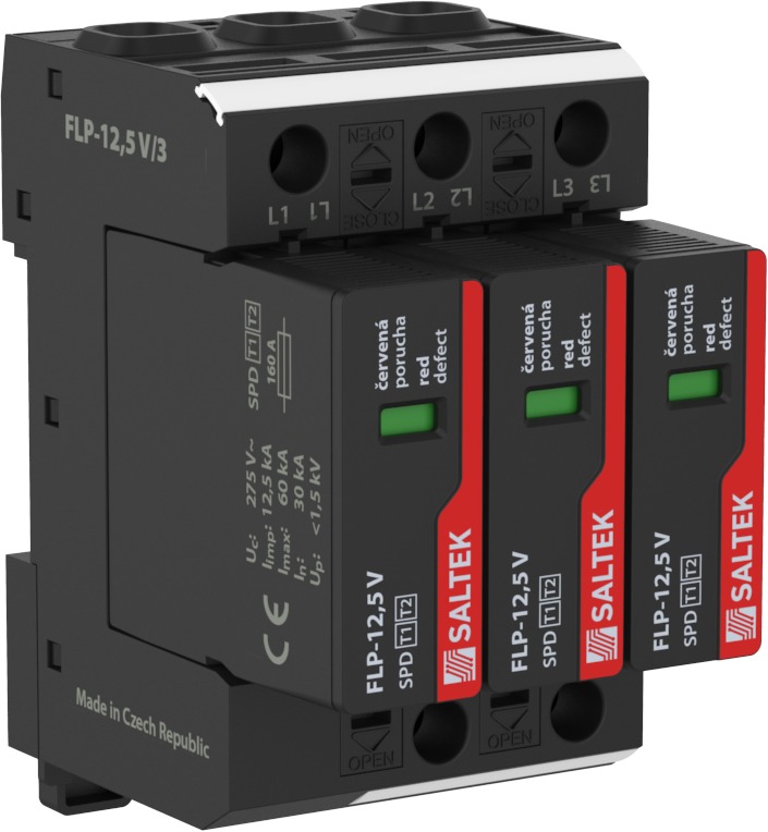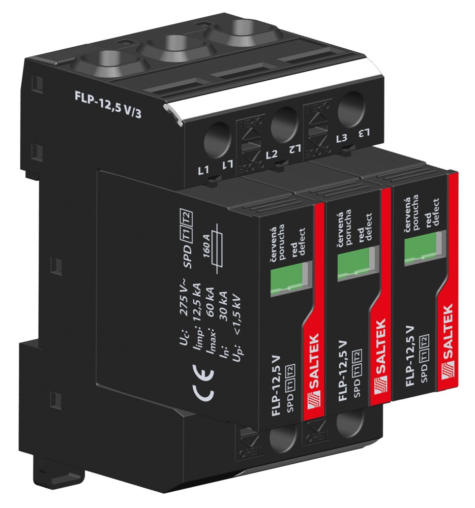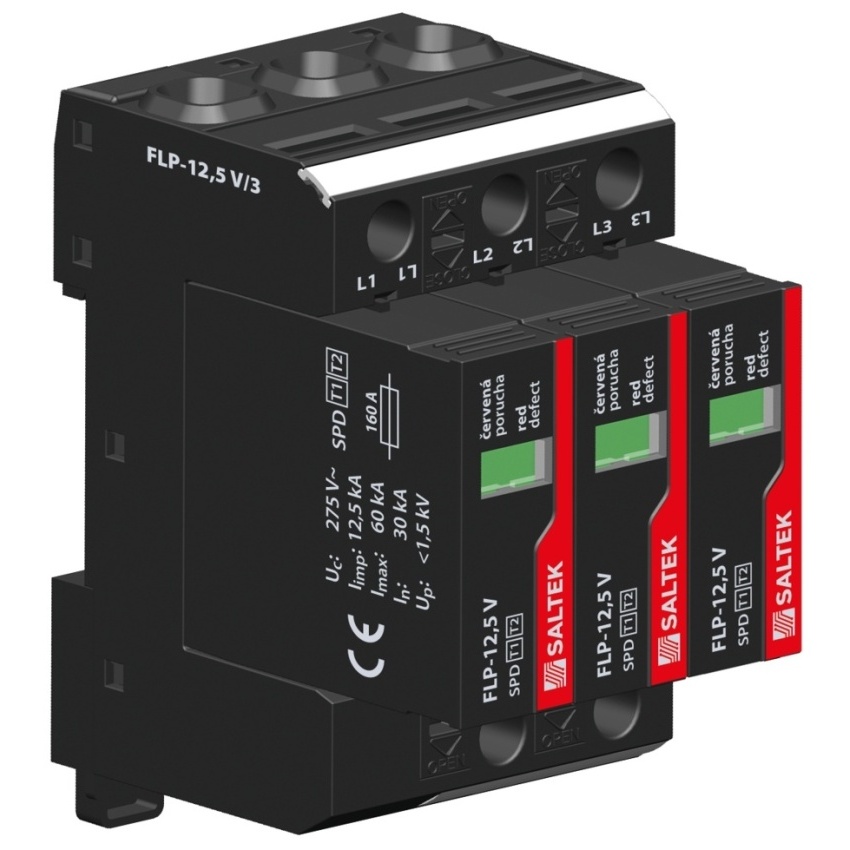 SALTEK SVODIČ FLP-12,5 V/3, TYP 1+2, 3X12,5KA/30KA, 230VAC, 3PÓL
