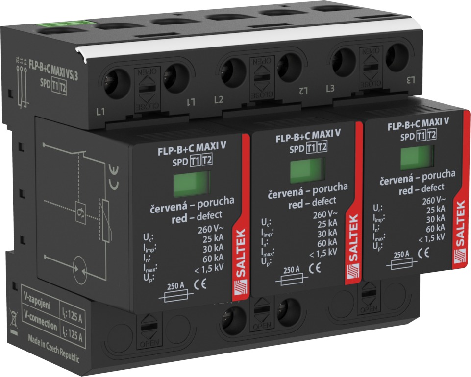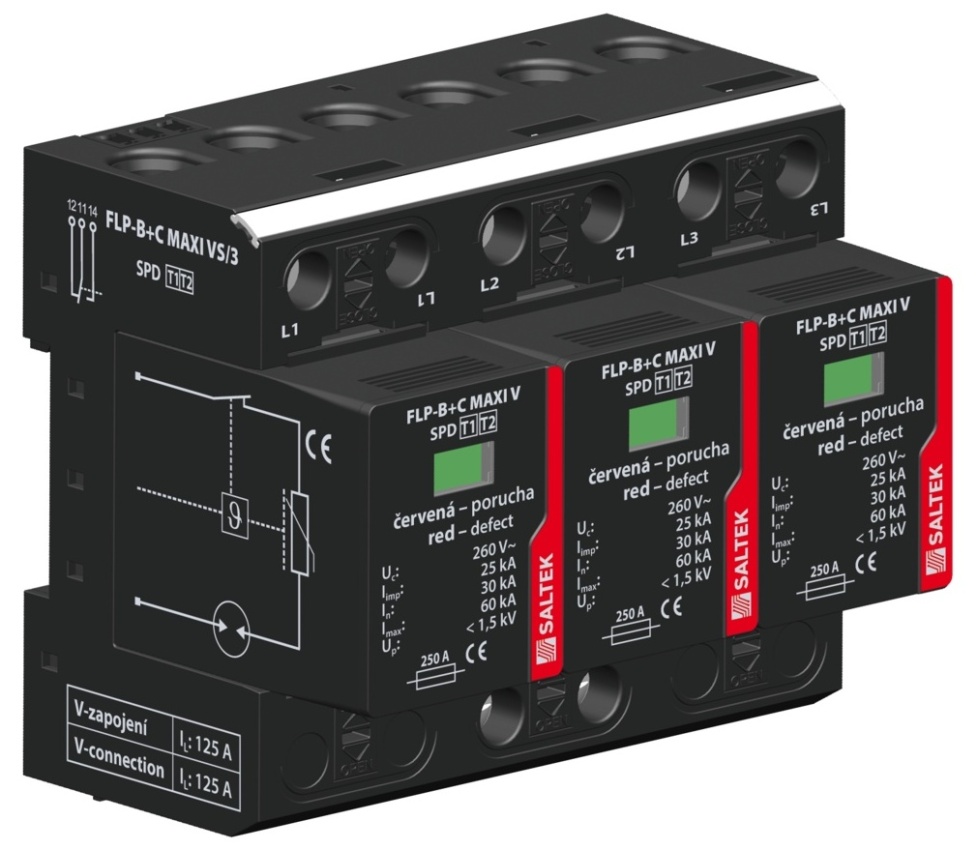 SALTEK SVODIČ FLP-B+C MAXI VS/3, TYP1+2, 3X25KA/30KA, 230V, 3PÓL, PRO SÍTĚ TN-C, DÁLK.SIG.