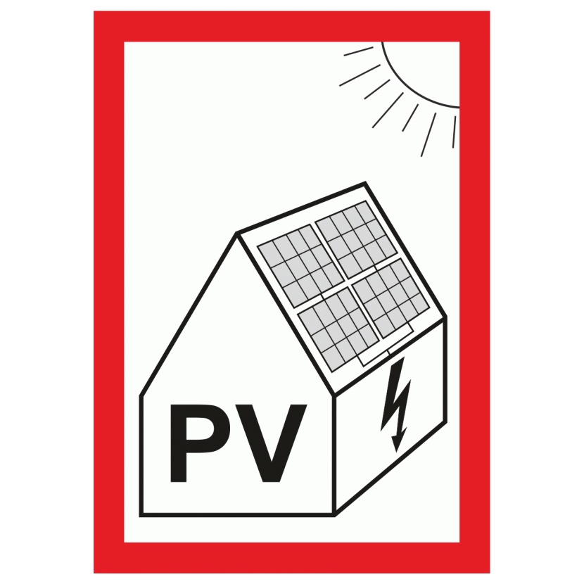 Značení, které signalizuje přítomnost solárního systému na budově podle ČSN 33 2000-7-712 .
