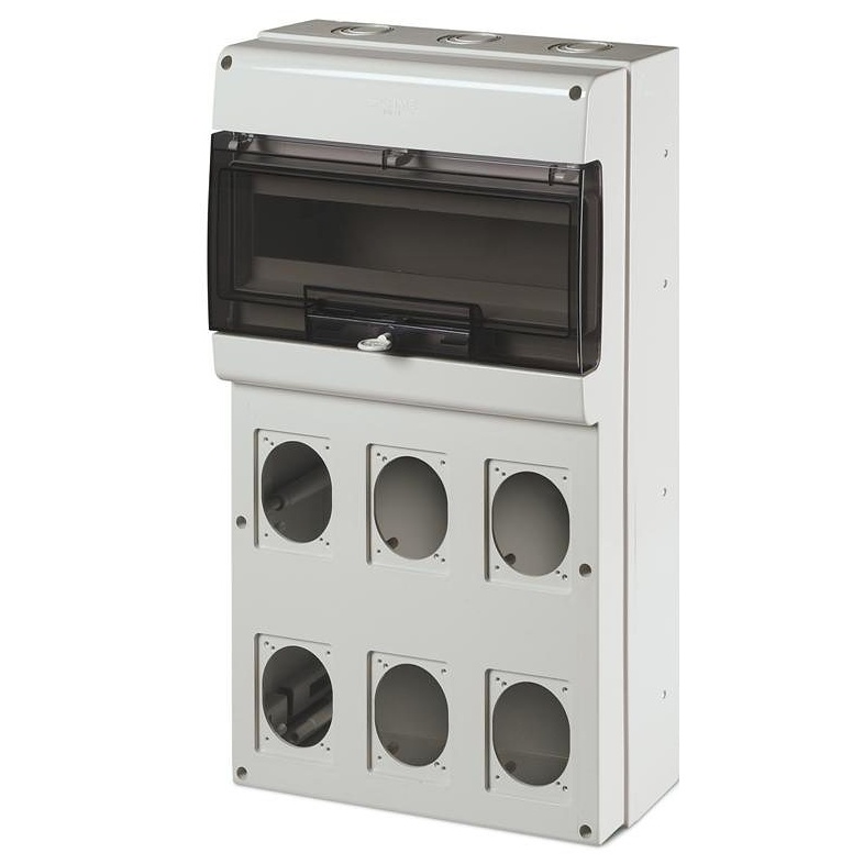 Přístrojová skříň pro nástěnnou montáž s průhlednými dvířky, se 6 otvory. Materiál skříně: odolný UV záření, halogen free.