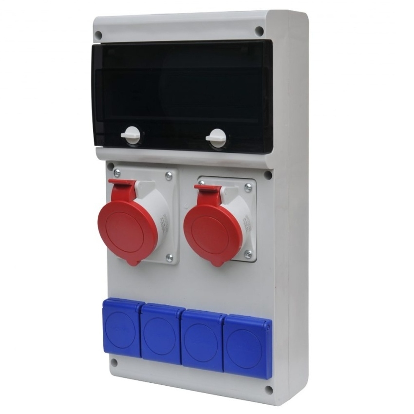 Zásuvková rozvodnice jištěná, s chráničem. Obsahuje 4x16A domovní, 1x16A a 1x32A průmyslové zásuvky. Počet jističů "MSB": 1xB16/1, 1xC16/3 a 1xC25/3.