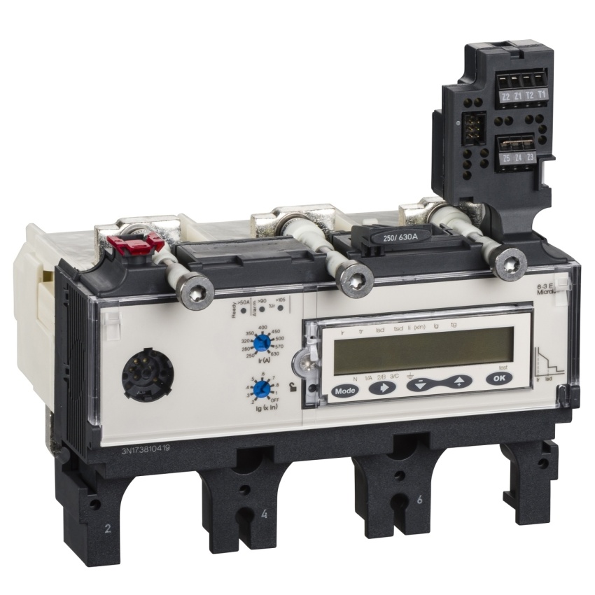 Jednotka spouští Schneider Electric LV432109 je elektronická jednotka Micrologic 6.3 E pro řadu ComPact NSX400 a Compact NSX630, se jmenovitým proudem jednotky spouští 400 A při 40 °C. Je určena pro síť AC 50/60 Hz a jmenovité pracovní napětí je 690 V AC. Jednotka poskytuje ochranné funkce LSIG (L – přetížení, S – zkrat, I – mžiková zkratová ochrana, G – zemní ochrana) a má 3 póly s popisem chráněných pólů 3t. V podkladech je uvedeno, že výroba byla ukončena dne 15. 6. 2023.
