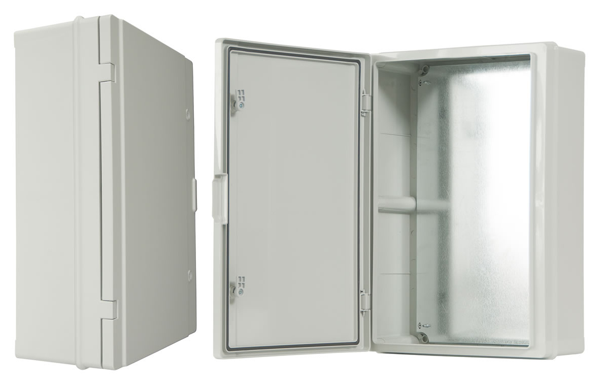 Univerzální plastový box IP65, vč. montážní desky, plné dveře.