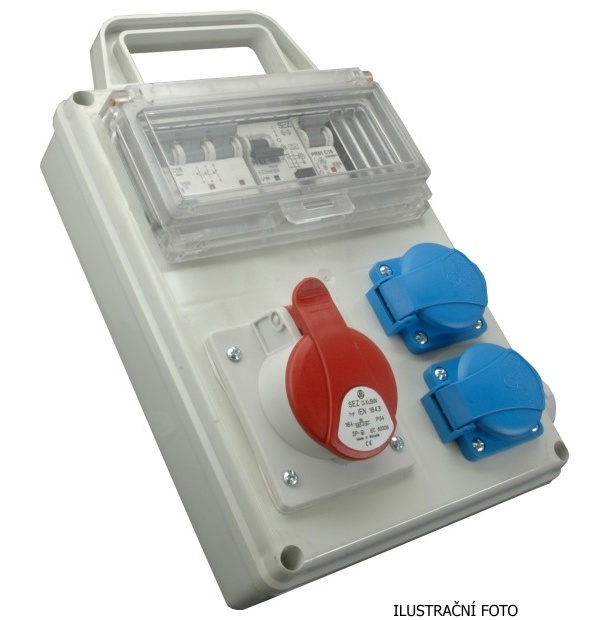 Rozvodnice zásuvková: 1 x IE 3253 + 2x230V/16A- jištěná + chránič IP44 s držadlem