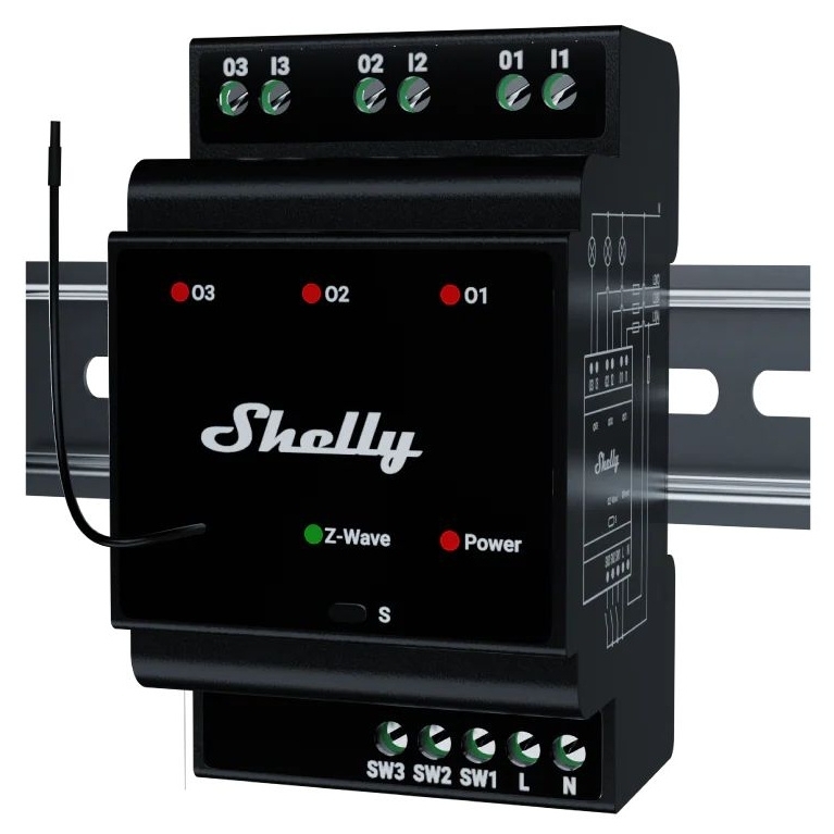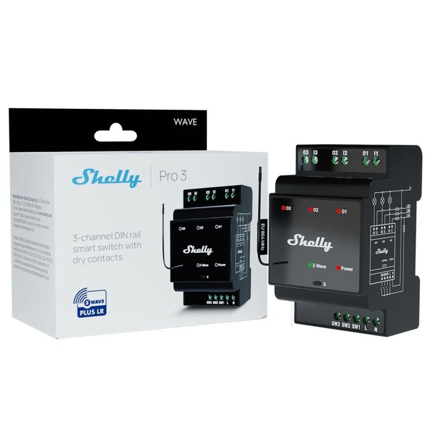 Shelly Wave Pro 3 LR je profesionální tříkanálový spínací modul určený pro montáž na DIN lištu, vybavený technologií Z-Wave Long Range a suchými kontakty pro spolehlivé řízení až tří nezávislých obvodů.