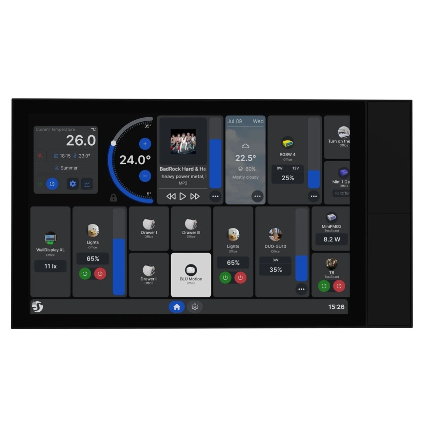 Shelly Wall Display XL v černém provedení nabízí prémiové řešení pro centralizované ovládání domácnosti bez nutnosti použití mobilních aplikací. Disponuje 10,1″ HD dotykovým displejem s kapacitní technologií, výkonným čtyřjádrovým procesorem a vestavěným relé pro spínání spotřebičů do 1500 W. Dvoupásmové připojení Wi-Fi 6 (2,4 / 5 GHz) a Bluetooth 5.4 zajišťuje rychlou a spolehlivou komunikaci. Panel obsahuje čtyři konfigurovatelná tlačítka, senzory přiblížení a okolního světla, přehled spotřeby energie z připojených zařízení Shelly PM a dvojici 2 W reproduktorů s podporou přehrávání médií i internetového rádia. Díky otevřenému ekosystému s MQTT a webhooky lze snadno propojit s Home Assistant a dalšími platformami. Robustní konstrukce s černým skleněným čelním panelem umožňuje instalaci do standardní EU nástěnné krabice.