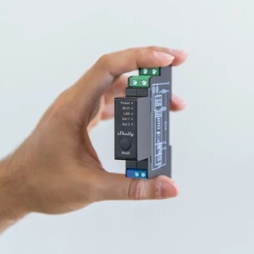 Shelly Pro 2PM je dvoukanálový inteligentní přepínač s možností měření výkonu, který lze namontovat na lištu DIN.