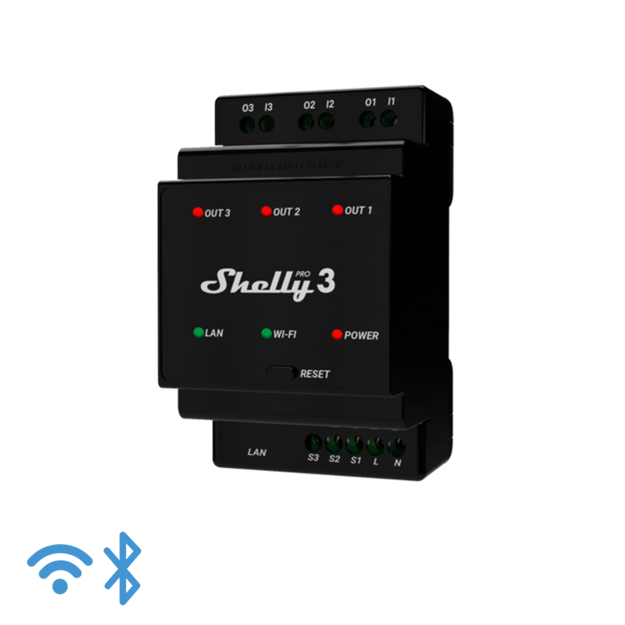 Shelly Pro 3 je profesionální 3kanálové relé na lištu DIN s beznapěťovými kontakty. Pro profesionální automatizaci světel a spotřebičů pro obytné nebo komerční použití.