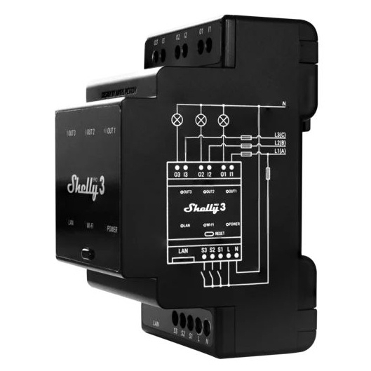 SHELLY PRO 3 Spínací modul na DIN lištu, 3 kanály, 3-fázové, 3x16A, max. zatížení 48A, WiFi, LAN, Bluetooth
