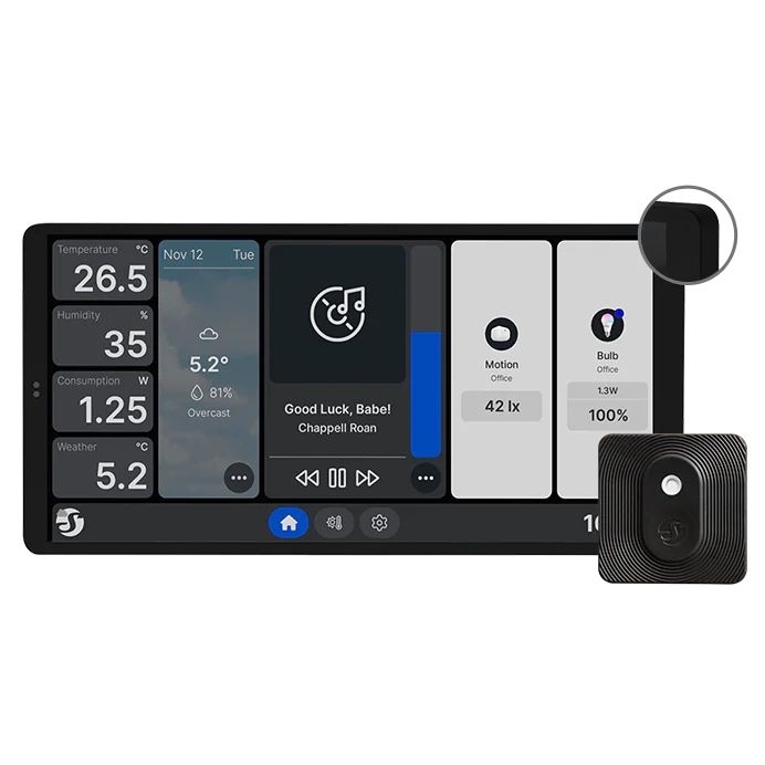 Shelly Wall Display X2 v elegantním černém provedení je moderní 6,96palcový nástěnný dotykový panel, který centralizuje řízení všech zařízení Shelly. Umožňuje snadné ovládání, monitorování i tvorbu scén prostřednictvím přehledného a přizpůsobitelného rozhraní. Panel disponuje integrovaným 5A relé pro přímé spínání spotřebičů, vestavěnými senzory teploty, vlhkosti a intenzity světla (LUX) a podporuje připojení přes Wi-Fi a Bluetooth. Díky funkcím plánování, scén a možnosti fungovat jako pokojový termostat přináší vysokou úroveň komfortu a automatizace. Instalace je rychlá – stačí jej umístit do běžné nástěnné krabice a připojit k napájení s neutrálním vodičem. Minimalistický design s nastavitelným jasem displeje zajišťuje, že panel perfektně zapadne do každého moderního interiéru.