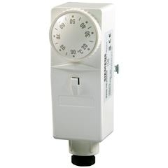Příložný termostat, 20...90 °C, upevňovací pružina, nastavení na krytu Elektromechanická regulace teploty (TR) s jednopólovými přepínacími kontakty Nastavení požadované teploty na krytu termostatu Pro regulaci teploty vody, oleje apod.