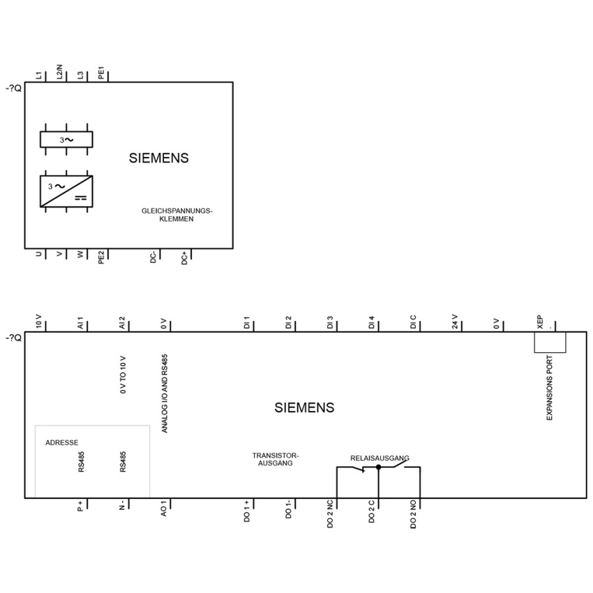 - USS (jednodílná rozvodna)a MODBUS RTU (vzdálená jednotka Terminal) na terminálech pro všestranné použití