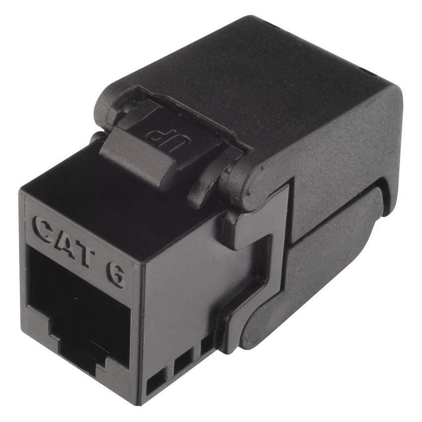 Samořezný nestíněný keystone CAT6, černý s Component Level a 4PPoE certifikací.