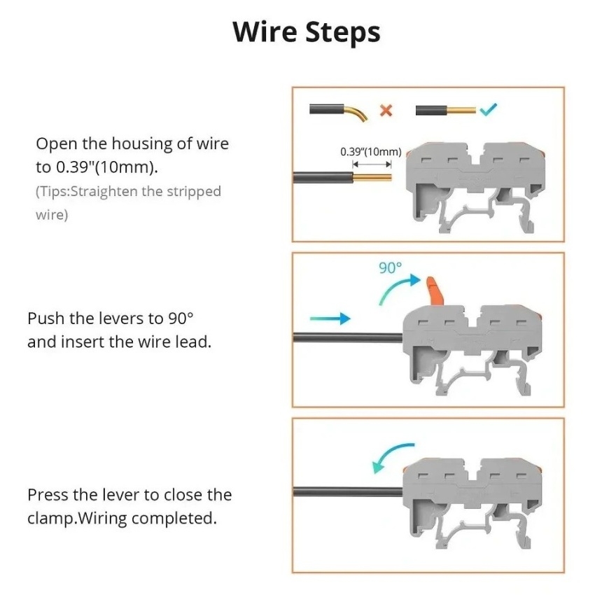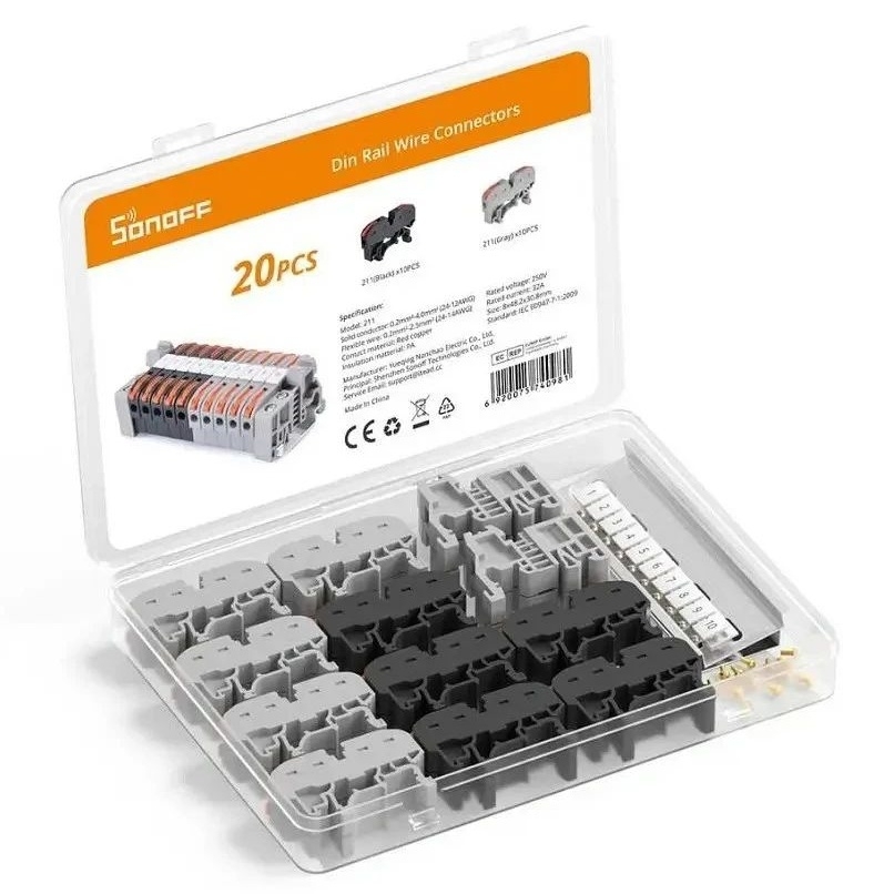 SONOFF 211 rychlosvorky pro vodiče na 35 mm DIN lištu umožňují beznástrojové, rychlé a bezpečné zapojení vodičů s pákovým mechanismem a měděnými kontakty. Izolace z nehořlavého PA66 zajišťuje odolnost při provozním napětí až 250 V a proudu 32 A.