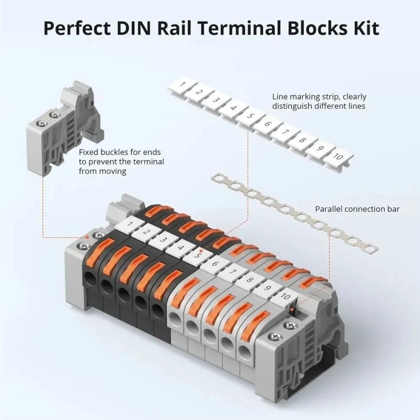SONOFF 211 rychlosvorky jsou určeny pro profesionální instalace na standardní 35 mm DIN lištu, kde umožňují rychlé a přehledné zapojení vodičů bez použití nástrojů. Sada obsahuje 20 pákových svorek pro vodiče o průřezu 0,2–4,0 mm? (pevné) a 0,2–2,5 mm? (lankové), dvě propojovací lišty, identifikační štítky, šrouby a koncové zarážky v průhledné krabici. Svorky mají měděné kontakty a izolaci z modifikovaného nylonu PA66, která je nehořlavá a odolná vůči korozi, nárazům a napětí až 4 kV, což zajišťuje spolehlivost a bezpečnost v rozvaděčích, ovládacích panelech a strojních zařízeních.