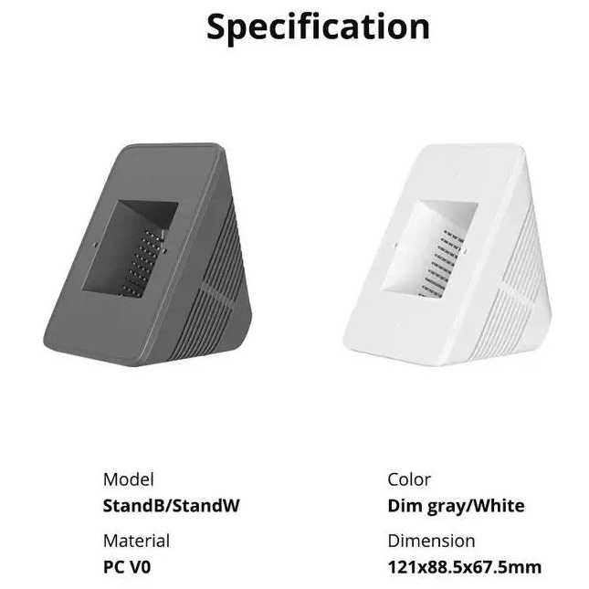 SONOFF stolní stojan pro NSPanel a NSPanel Pro v odstínu Dim Gray přemění nástěnný panel na samostatně stojící ovladač s pevným trojúhelníkovým designem proti převrácení a ergonomickým úhlem sledování. Konstrukce z samozhášivého polykarbonátu PC V0 zajišťuje odolnost a ventilaci, zatímco zacvakávací montáž bez nářadí umožňuje rychlou instalaci. Integrovaný kanálek pro vedení kabelů udržuje pracovní plochu uklizenou a moderní tmavě šedé provedení ladí s různými interiéry.