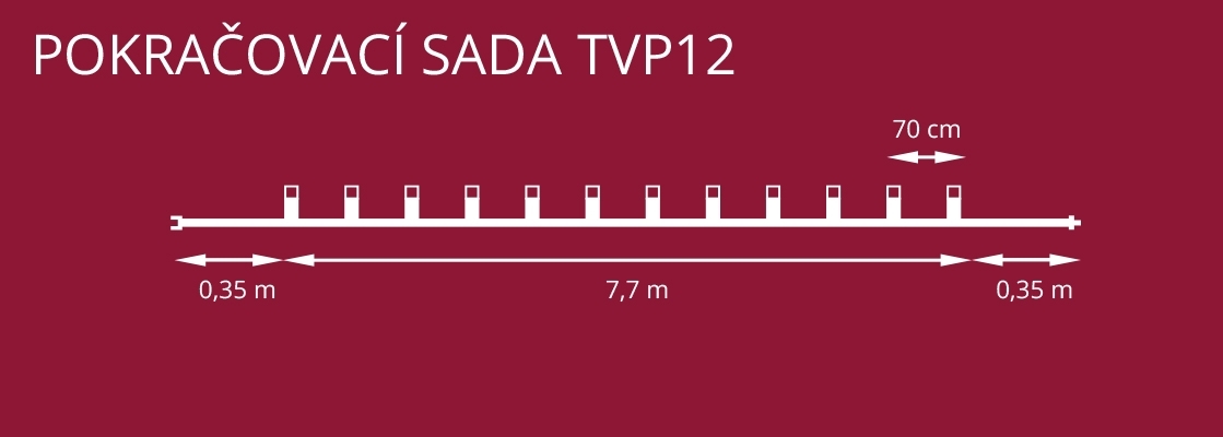 Prodlužovací souprava TVP-12 bez napájecího transformátoru. jednotlivé světelné zdroje svítí nezávisle na sobě. Tvarovková prodlužovací souprava je určena pouze k připojení k základní soupravě Sada START. Nemá vlastní zdroj napájení a má krátký přívod pouze 35 cm. K základní soupravě TVAROVKA "Sada START" je možné připojit MAXIMÁLNĚ 3 prodlužovací soupravy Tvarovka TVP-12 . Maximální délka svítící části řetězu je potom 30,8 m.