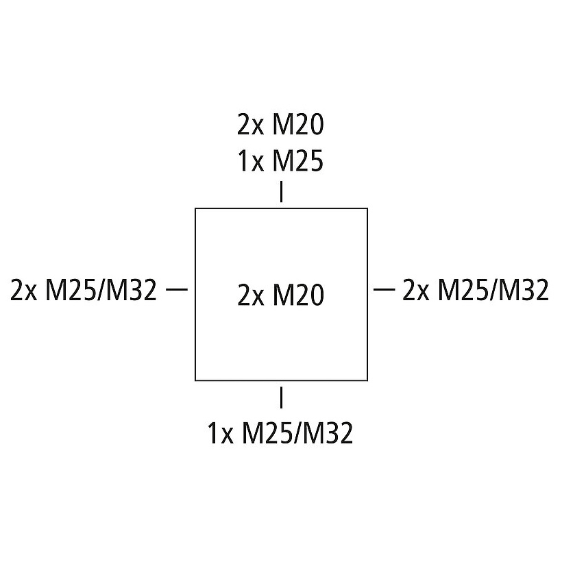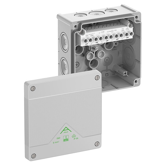 - Spojovací skříň, třída ochrany IP66, jmenovitý průřez 6 mm ², certifikovaný podle VDE ( DIN EN 60670-1 / -22 ( VDE 0606-1 / -22 ) ), DLG ( Odolnost proti amonie, měkké zaváděcí membrány, M20 / M25 / M32, těsnicí rozsah 4 - 28 mm, ( 2 zadní, 8 boční ), vnitřní upevňovací body, pro standardní vnitřní a chráněné venkovní instalace