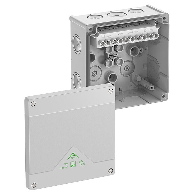 - Větev s ochrannou třídou IP66, jmenovitý průřez 10 mm ², certifikovaný podle VDE ( DIN EN 60670-1 / -22 ( VDE 0606-1 / -22 ) ), DLG ( Odolnost vůči amoniaku, Rozsah těsnění 8-28 mm, ( 2 zadní, 10 boční ), vnitřní upevňovací body, pro standardní vnitřní instalace a chráněnou venkovní plochu, šedá, Ui = 690 V AC, v = 57 A, se šroubovým svorkou nahoru, 5-pin-10 ², upínatelné průřezy na tyč: 4 x 2,5 mm ², 4 x 4 mm ², 4 x 6 mm ², 4 x 10 mm ² Cu tuhé / ohebné s koncovým rukávem
