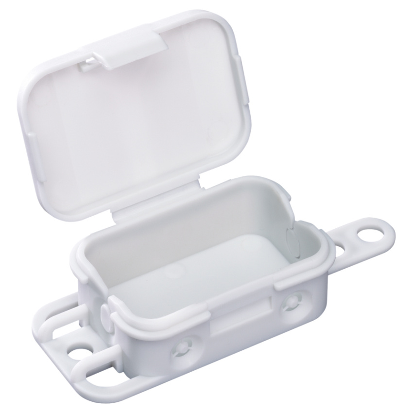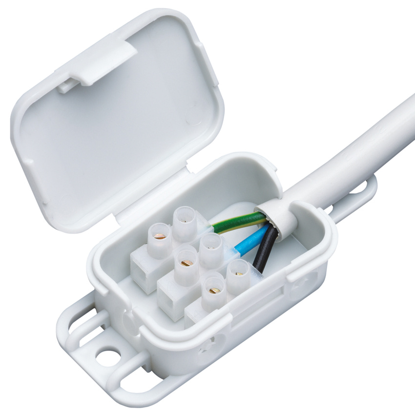 Spojovací krabice podle DIN EN 60598 (VDE 0711), 4 přívody, s odlehčením v tahu podle DIN VDE 0606, z toho 2 ks přístupné shora, Svorka pro odlehčení v tahu pro závěsná svítidla, s vnějšími místy připojení, s krytím IP20, do 2,52, s pevností IK07, třída ochrany II, VDE zkouška, bez halogenů, 56 x 40 x 23 mm, šedá, bez svorky.