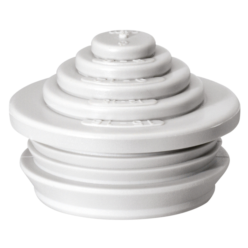 Stupňovitá vývodka s uzavřenou těsnicí membránou, lze ji odříznout v několika stupních, termoplastický elastomer, krytí IP55.